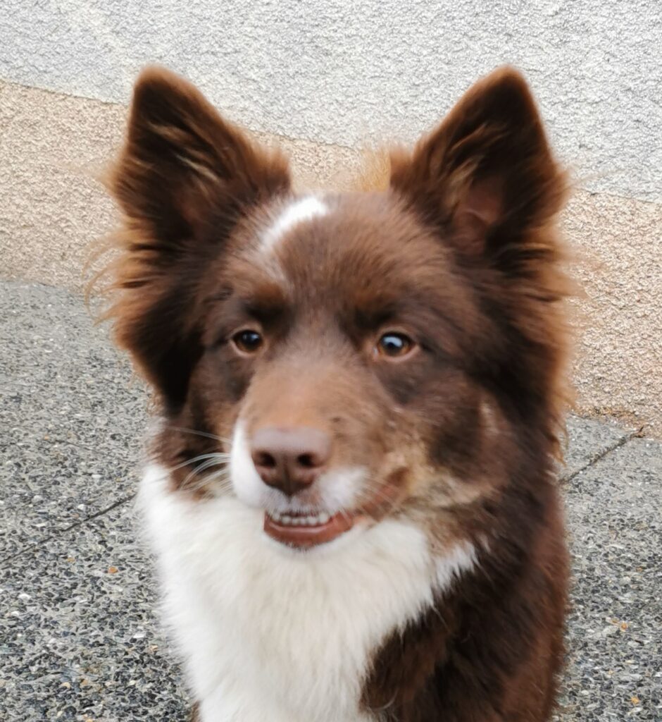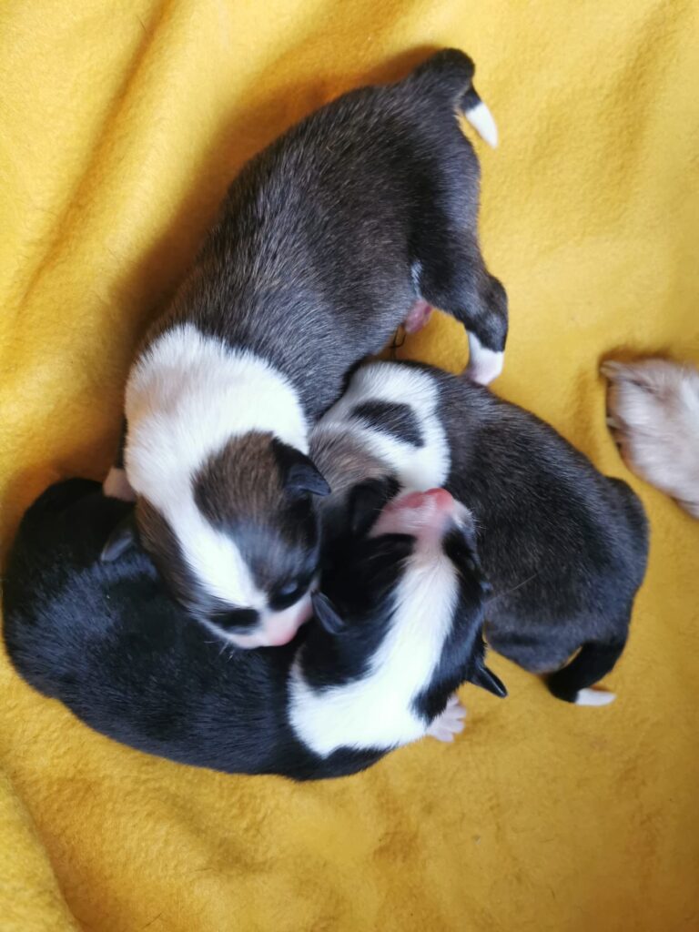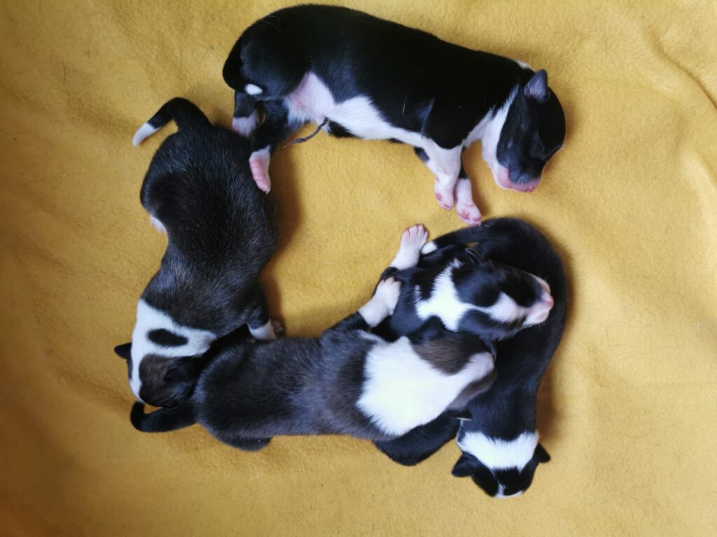 Het teefje is zwart met veel wit, evenals twee reutjes. De twee andere reutjes zijn rood met wit.