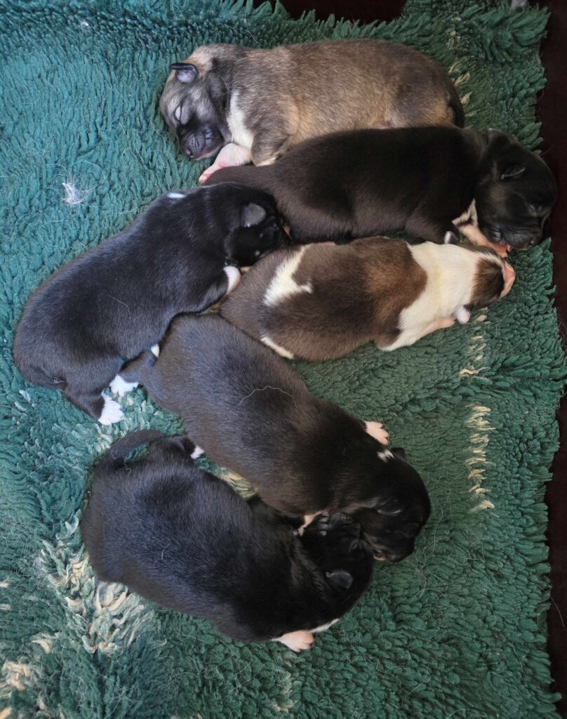 Er zijn 3 reutjes en 3 teefjes. 1 reu is rood met wit, evenals 1 teef. De andere pups zijn driekleuren (zwart met witte en bruine aftekeningen).