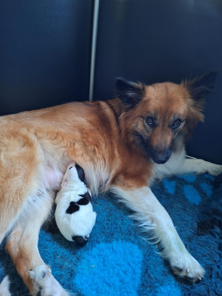 Op 21 januari is Kolla bevallen van 1 pup, een mooi teefje. Het teefje is overwegend wit met zwarte aftekeningen.